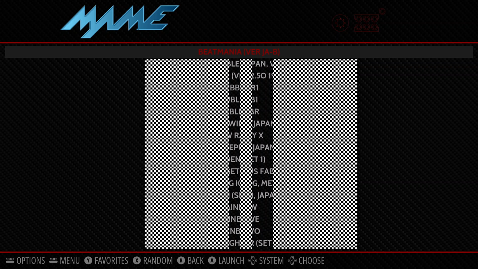 게임 메뉴에서 화살표로 MAME를 선택한다. 이렇게 준비된 게임들이 표시된다. 그러면 화살표를 이용하여 해당 게임에 가져다 대고 실행하면 된다. 아래에 보면 키 설명이 나오는데, 앞서서 어떤 키보드에 매핑했는지 잘 기억하고 진행하면된다.