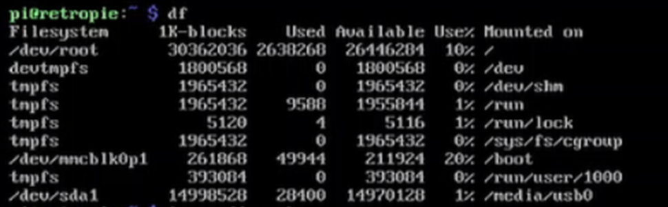 아래의 df 결과를 보면, /dev/sda1로 표시되는 항목이 있는데 해당 항목이 usb 메모리이다. 어떻게 확신하냐면, 뒤에보면 외장 미디어장치연결 경로에 usb0으로 표시되었기 때문이다. 물론, 리눅스를 잘 하는 독자라면 fdisk 명령을 통해서 확인할 수도 있었겠지만 말이다. dmesg명령도 있고 어쨋거나 /media/usb0안에 roms라는 폴더(디렉터리)가 있고 그 안에 게임이 들어있다.