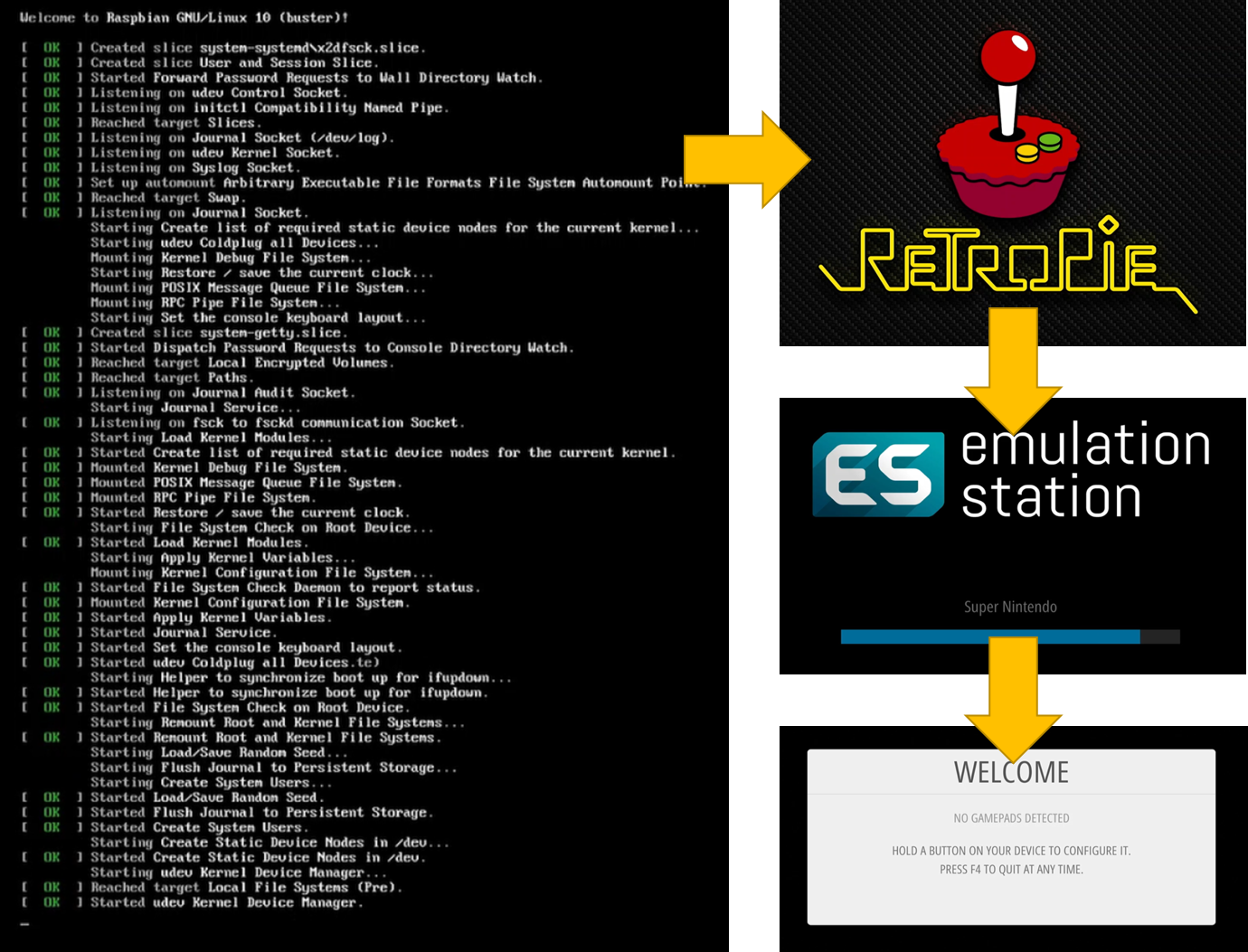 대략 순서는 이렇게 된다. 부팅하면서 장치 확인하고 이것저것 설정하고 설치한다음에 레트로 파이 로고 뜨고, 터미널 뜨다가 ES로고뜨고 뭔가 설치하고... 마지막에 웰컴 화면이 표시된다.