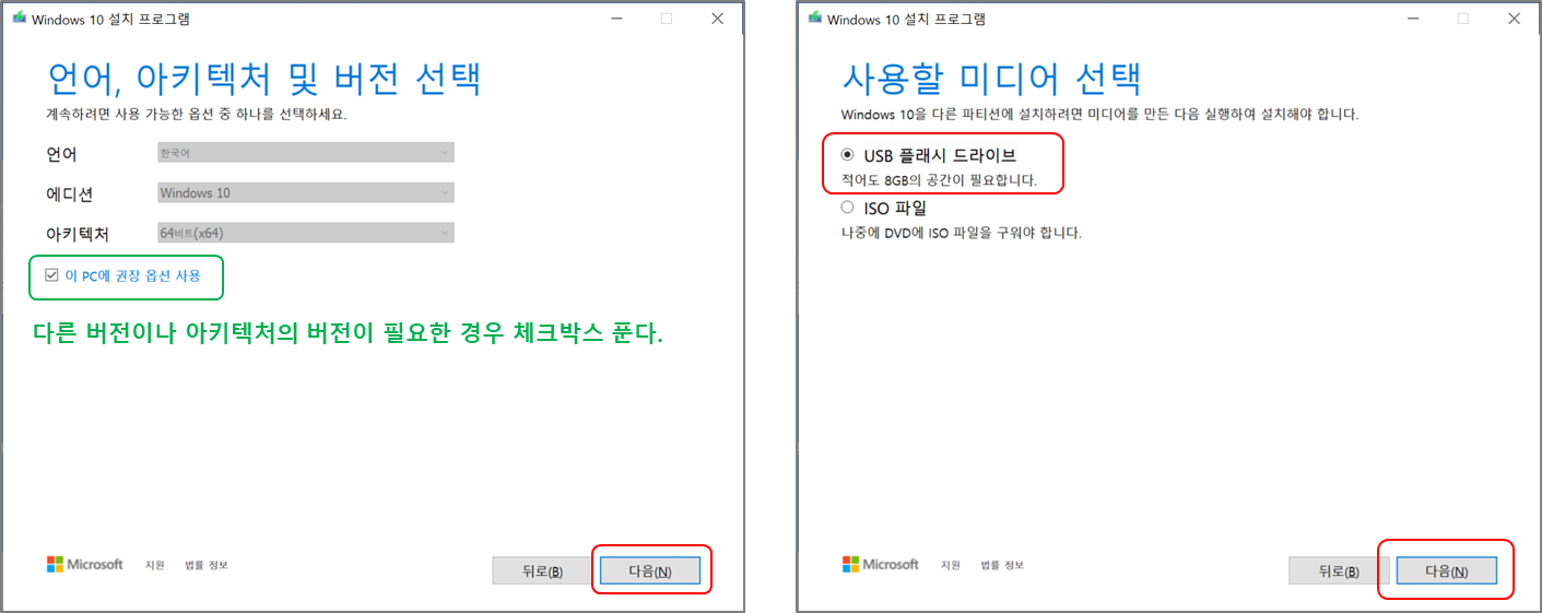 기본적으로는 사용하는 PC와 동일하게 선택되는데, 만약 Windows 11이나 32비트등 변경하고 싶은 경우라면 체크박스를 해제하면 선택할 수 있다. 해당 목적이 아니라면 체크박스를 유지하고 계속진행한다.
