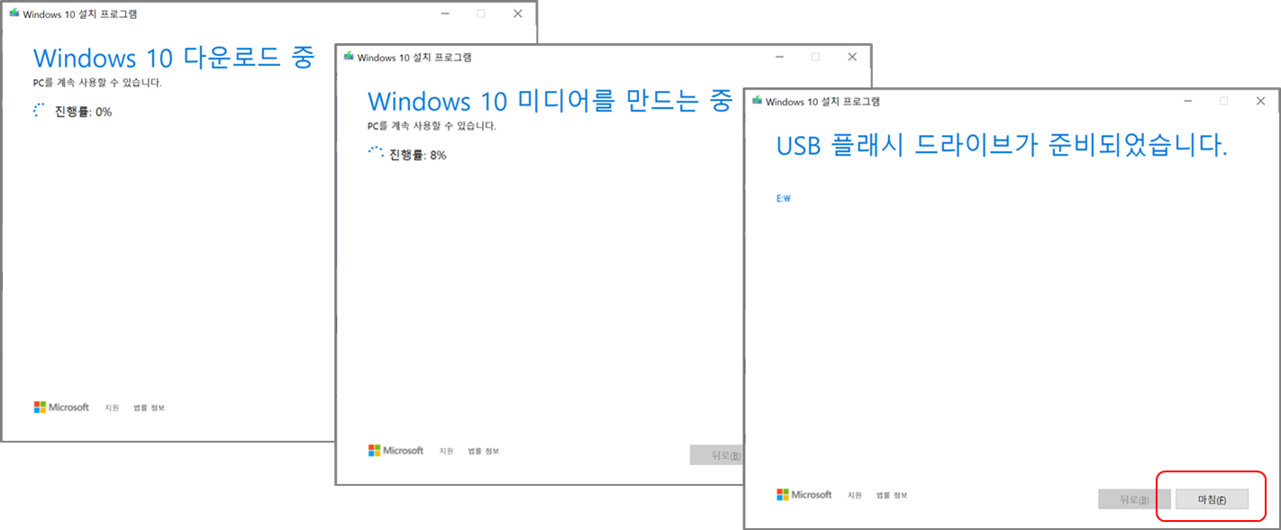 그러면 아래의 그림과 같이 Windows 10 다운로드 중 > 검사 중> 만드는 중 이렇게 세분의 스님을 만나게 된다. 그리고 좀더 기다리면, 부팅용 Windows 10 USB가 생성된다. 마침을 눌러서 창을 닫는다.