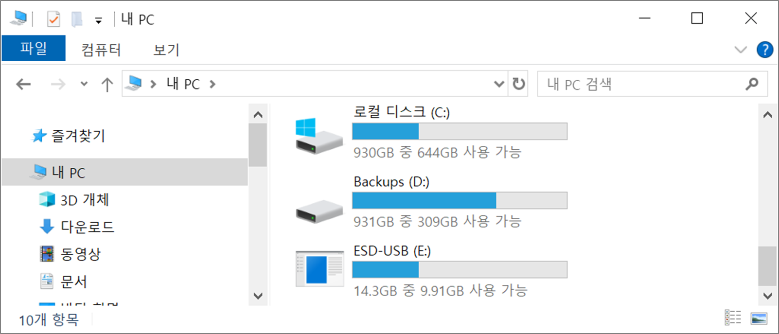 탐색기에서 USB 드라이브를 확인해보자. USB쪽 드라이브에 ESD-USB라고 표시되면 확인까지 완료된 것이다. 혹시 용량이 작게 나오면 탐색기에서 F5번을 눌러서 갱신하면 설치된 용량이 제대로 표시된다. 그리고 USB 드라이브 ICON은 필자와 다르게 표시될 수 있으니 무시하도록 하자.