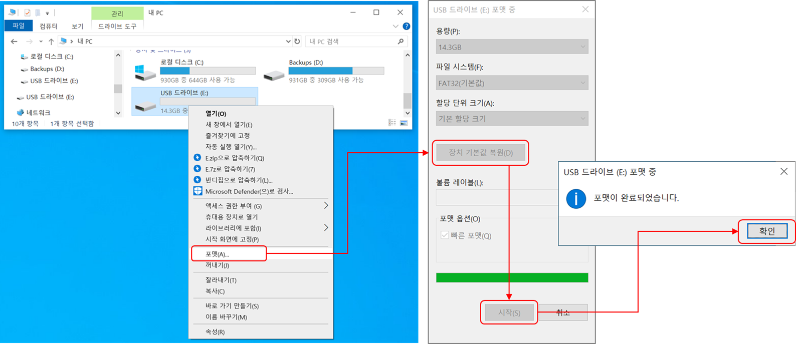 탐색기에서 USB 드라이브에서 마우스 우측클릭한다. 그리고 팝업 메뉴가 뜨면 포맷을 선택하여 포맷 다이얼로그가 출력되도록 한다. 포맷 다이얼로그에서 "장치 기본값 적용"을 클릭후 시작을 눌러 포맷을 진행시킨다음 포멧이 완료 다이얼로그를 닫는다.