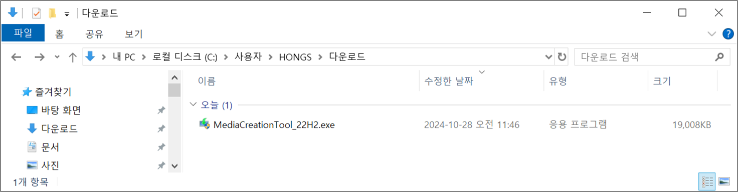 다운로드 받은 윈도우 이미지 생성도구(MediaCreationTools_22H2.exe)를 더블클릭하여 실행한다.