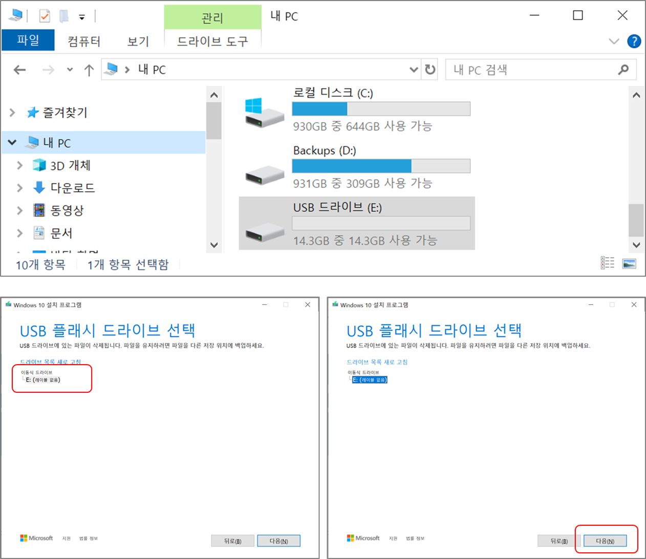 아래의 탐색기 그림에서 이전에 포맷했던 USB 드라이브 (E:)를 확인했으니, USB 플래시 드라이브 선택에서 E:를 선택해주면되겠다.