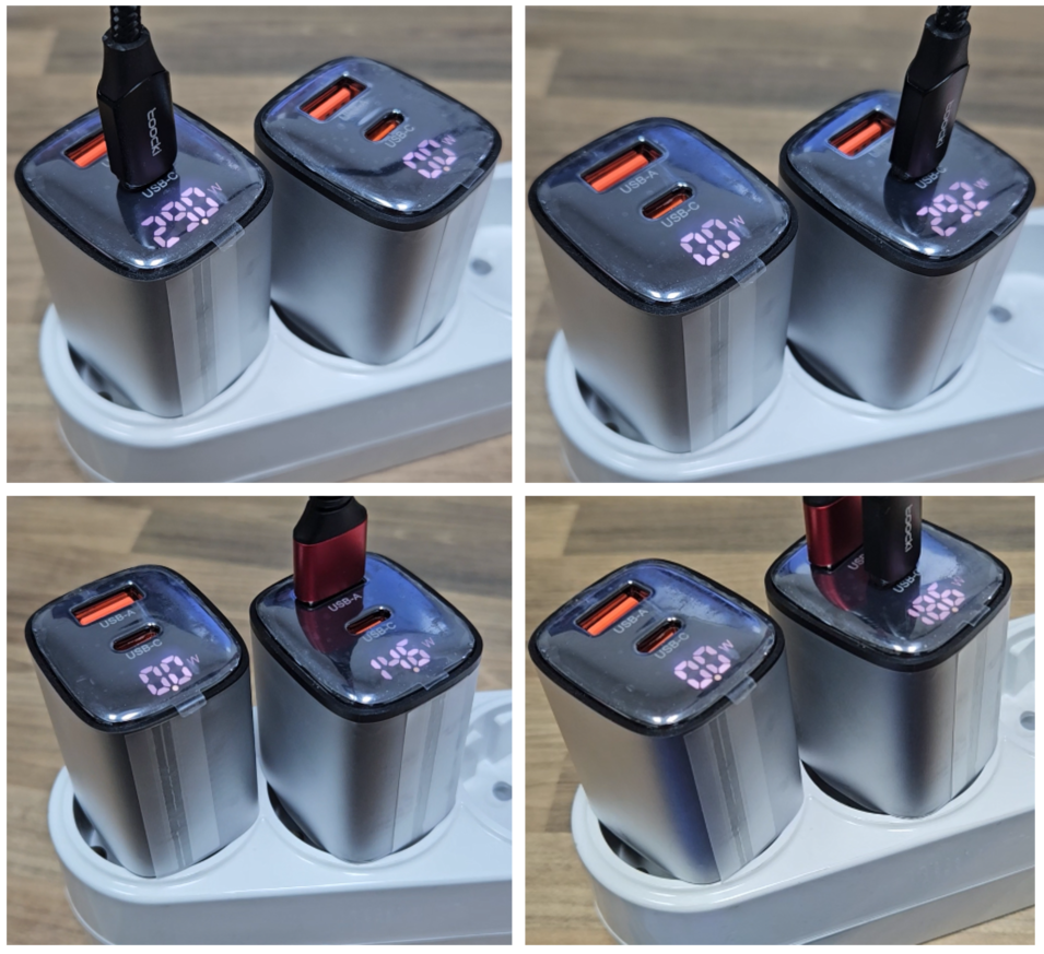두개를 샀으니 모두 테스트를 진행했다. 우선 개별 C 타입이용시 적당히 30W 부근이 출력됨을 알수 있다. 그리고 A타입을 이용하면 15W, 두 포트를 다 쓸 때는 18W정도로 출력이 되었는데, 아쉽게도 두 폰이 모두 충전이 잘되어있는 상태에서 연결된 거라 정확하게 측정되지는 못했다.
