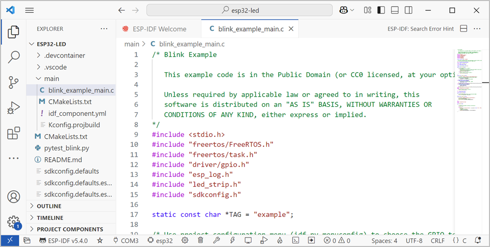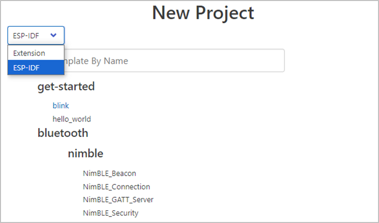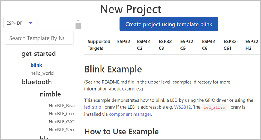 ESP-IDF를 선택하면 기본 예제들이 출력된다. 해당 예제들 중에서 blink를 선택한다