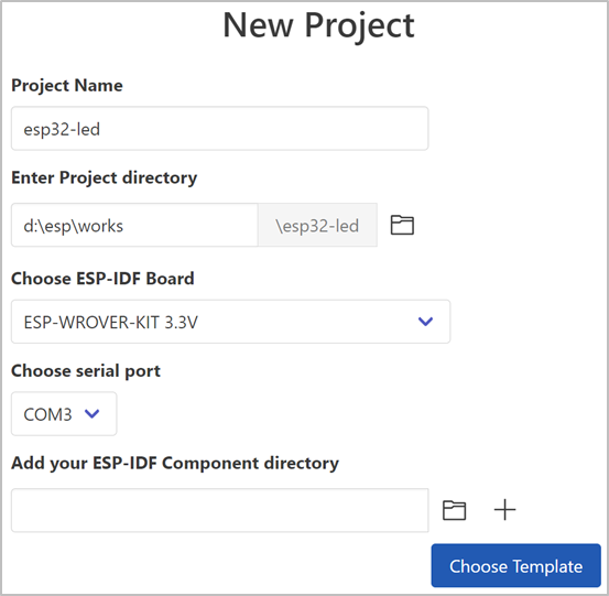 프로젝트 이름, 저장위치, 사용하는 보드를 선택한다. 이미 장치가 연결되어있다면 아래와 같이 컴포트를 지정할 수 있다. 만약, 기존 템플릿(예제)를 이용하고자 한다면 Choose Templete를 클릭한다