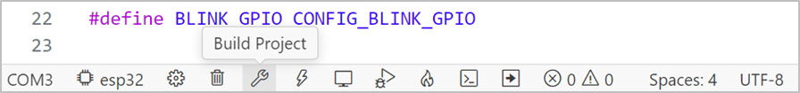 프로젝트가 생성되면 프로젝트에 대한 세부설정을 변경해야 될 수 있다. 화면 하단의 톱니바퀴 아이콘[(SDK Configuration Editor (menuconfig)]을 클릭한다.