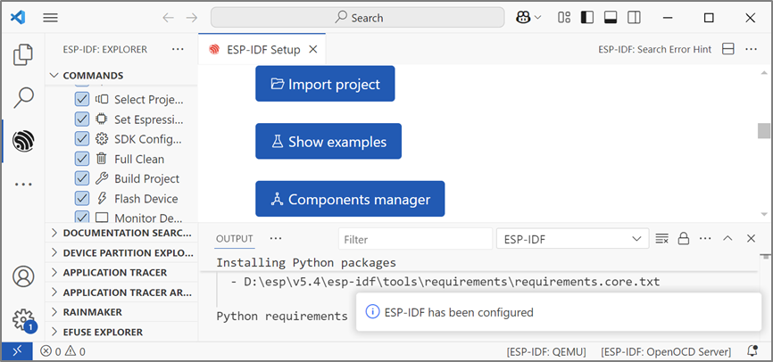 새 프로젝트가 열리게 되면 화면 중앙 상단에 사용할 ESP-IDF 버전을 선택하는 항목이 표시된다. 설치된 ESP-IDF 항목을 선택.