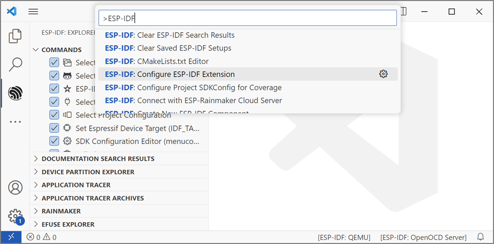 설치가 완료되면 설정을 진행하여야 한다. 인트로 화면을 닫고 F1키를 눌러 검색라인에서 “ESP-IDF: Configure ESP-IDF Extension”을 선택한다.