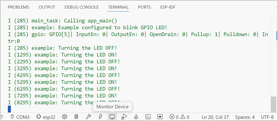 디바이스 모니터 아이콘을 클릭하면 터미널에서 장치가 동작하는 것을 확인할 수 있다.