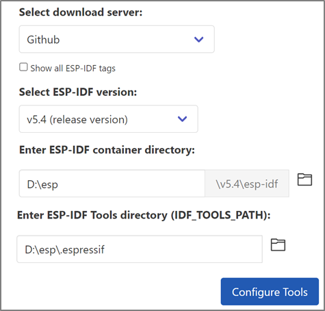 ESP-IDF 버전과 설치장소를 설치버전은 가능하면 최신버전을 지정하고, 설치위치는 사용이 편리한 적당한 위치를 설정한다.