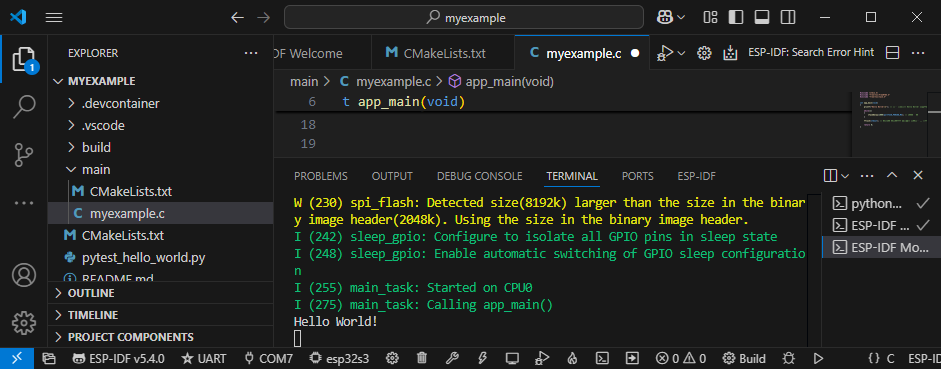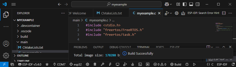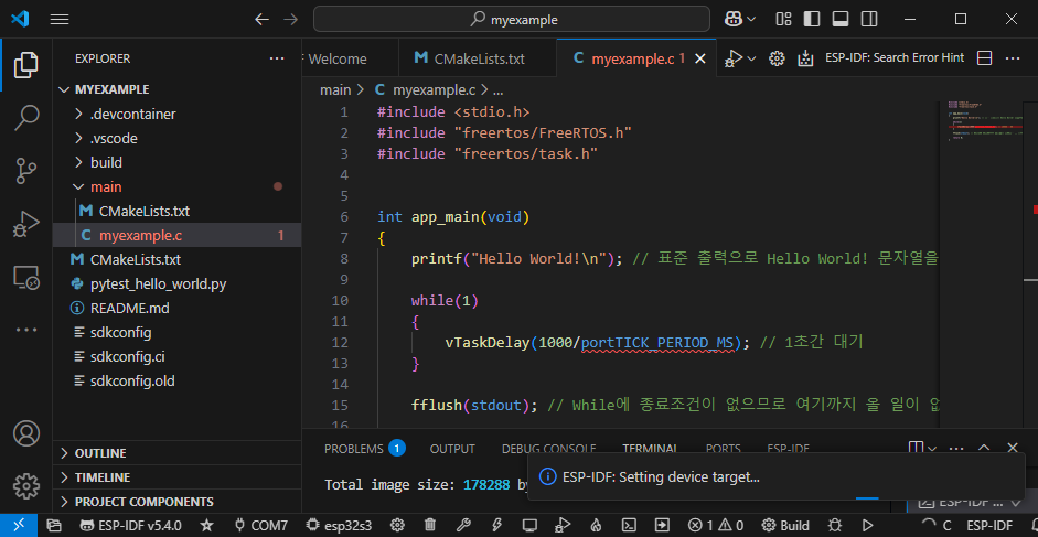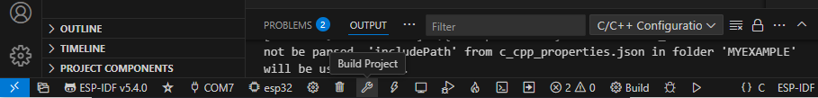 빌드 테스트를 진행해서 정상적으로 빌드가 되는지 확인한다. 스페너아이콘을 클릭하여 정상적으로 빌드되는지 확인하여 ESP-IDF가 정상적으로 연결되는지 확인을 하고 오류가 발생된다면 처리하도록 하자. 필자는 별다른 오류가 발생되지 않았다.