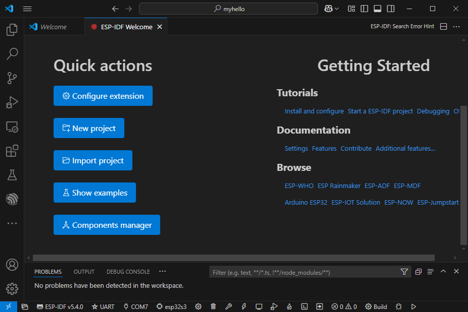 Visual Studio Code(이하, VSCode 또는 VSC)를 실행하고 ESP 플러그인을 선택하면, Quick Action 이 표시된다. 신규 프로젝트를 만들기 위해서 New Project를 클릭한다.
