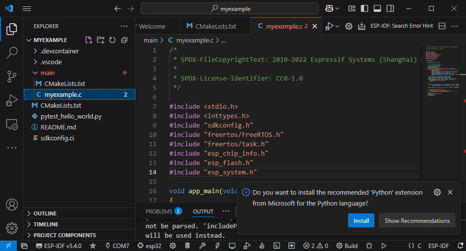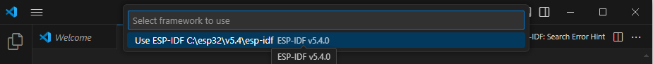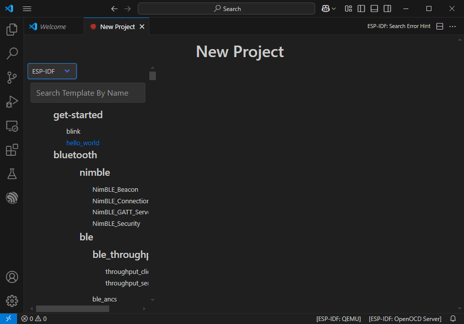 프로젝트가 생성될 때 화면 상단의 ESP-IDF를 선택해주어야 한다.