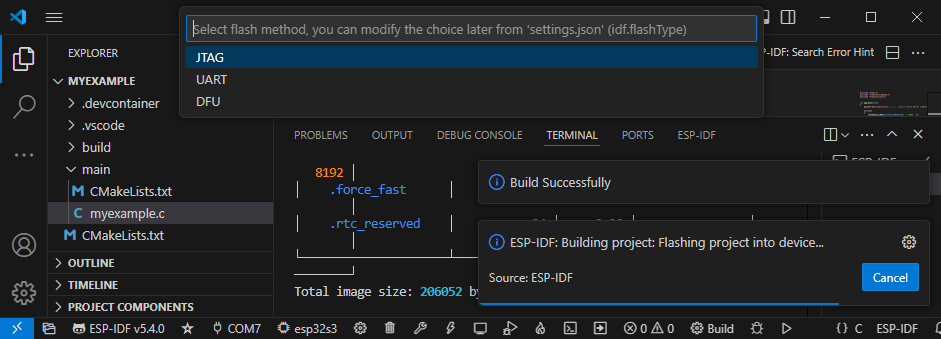 빌드가 정상적으로 성공했다면 플래시를 하기 위해서 번개표시를 선택하도록 한다. 이때 VSC하단의 통신설정 확인하고, 장치 설정도 확인하여야 한다. 필자는 현재 esp32-s3 시리즈를 사용하고 있으므로, esp32를 클릭하여 올바른 장치를 선택하여야 한다.