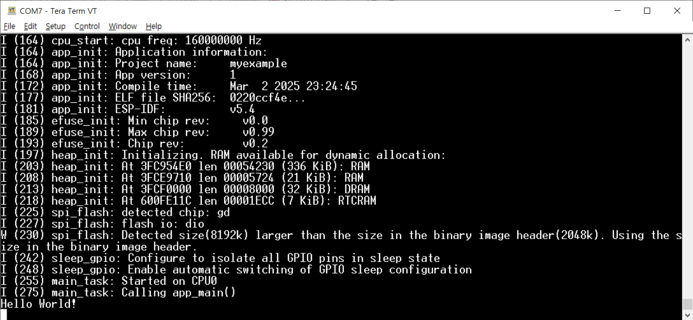 결과를 확인해 봤는가? 만약 터미널에서 확인하고 싶다면 Teraterm이나 Putty등을 이용해서 확인할 수 있다. 이 경우에는 시리얼 포트의 속도를 115200으로 설정하면된다.