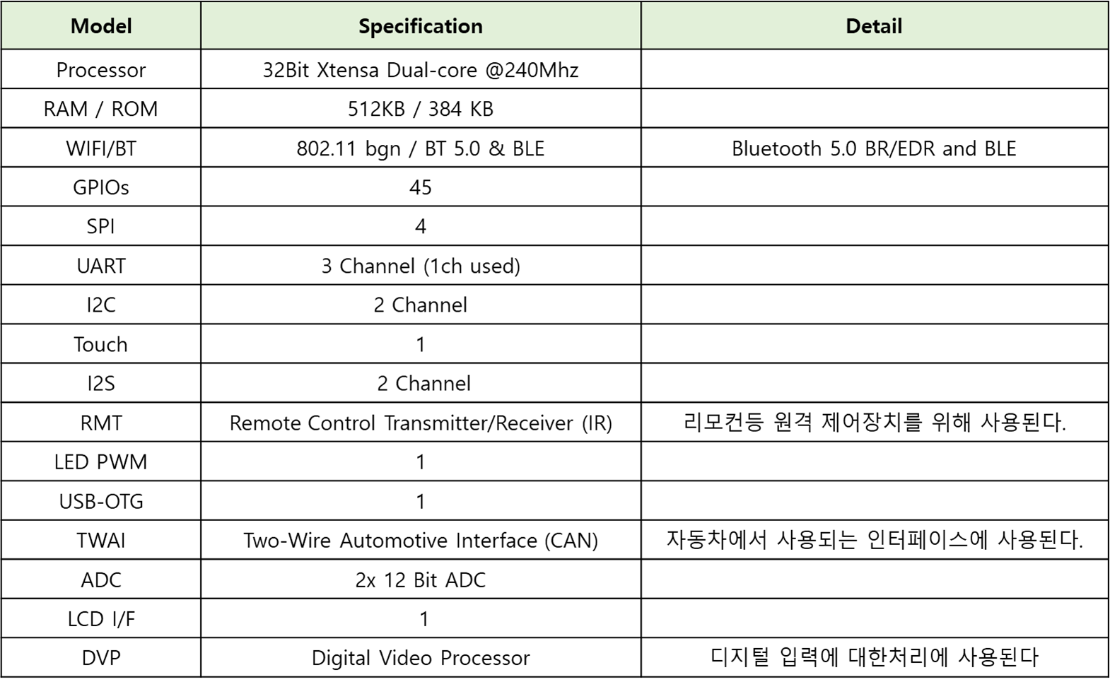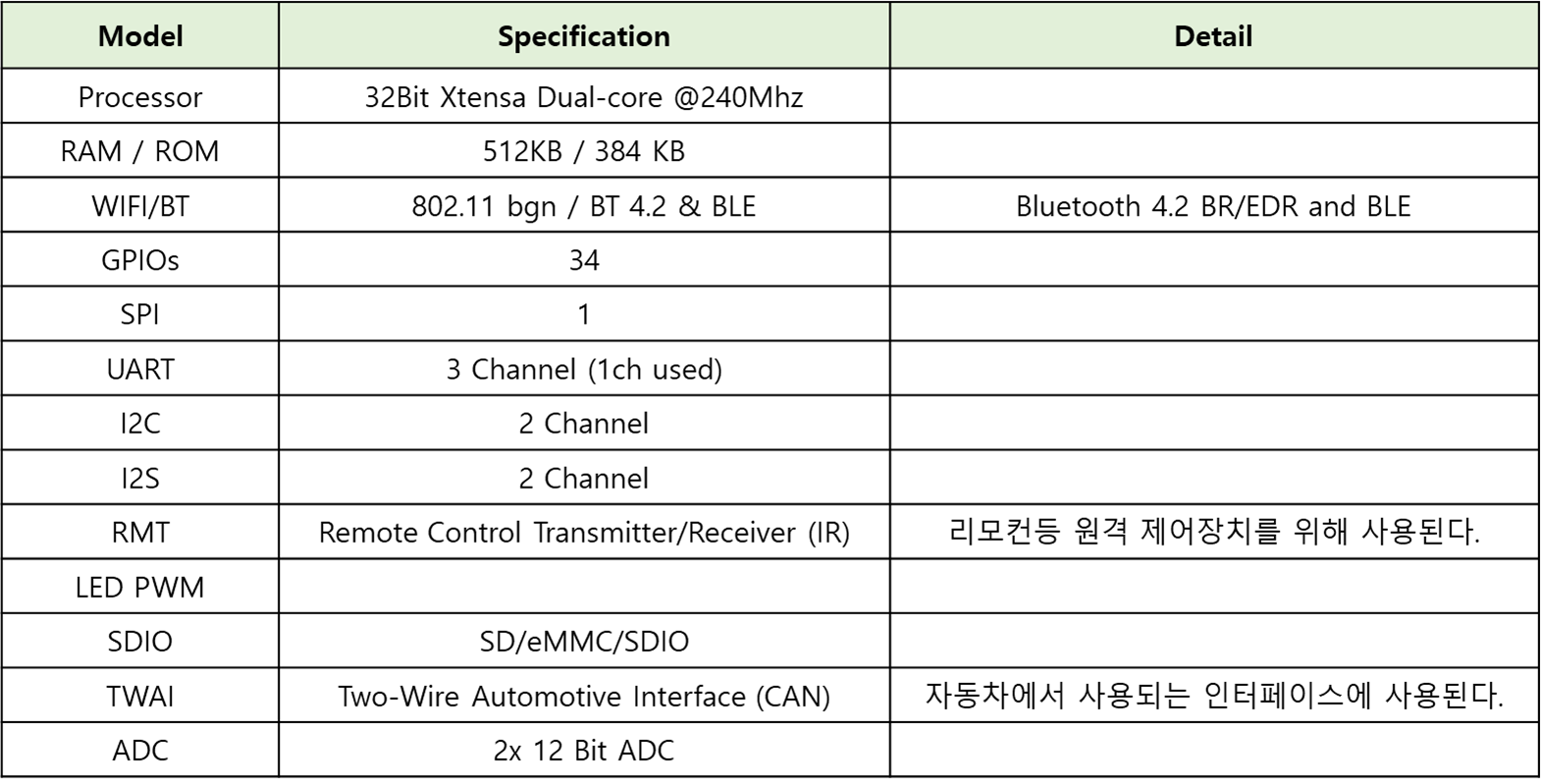 ESP32-WROOM 칩의 기본 스펙은 아래와 같다.