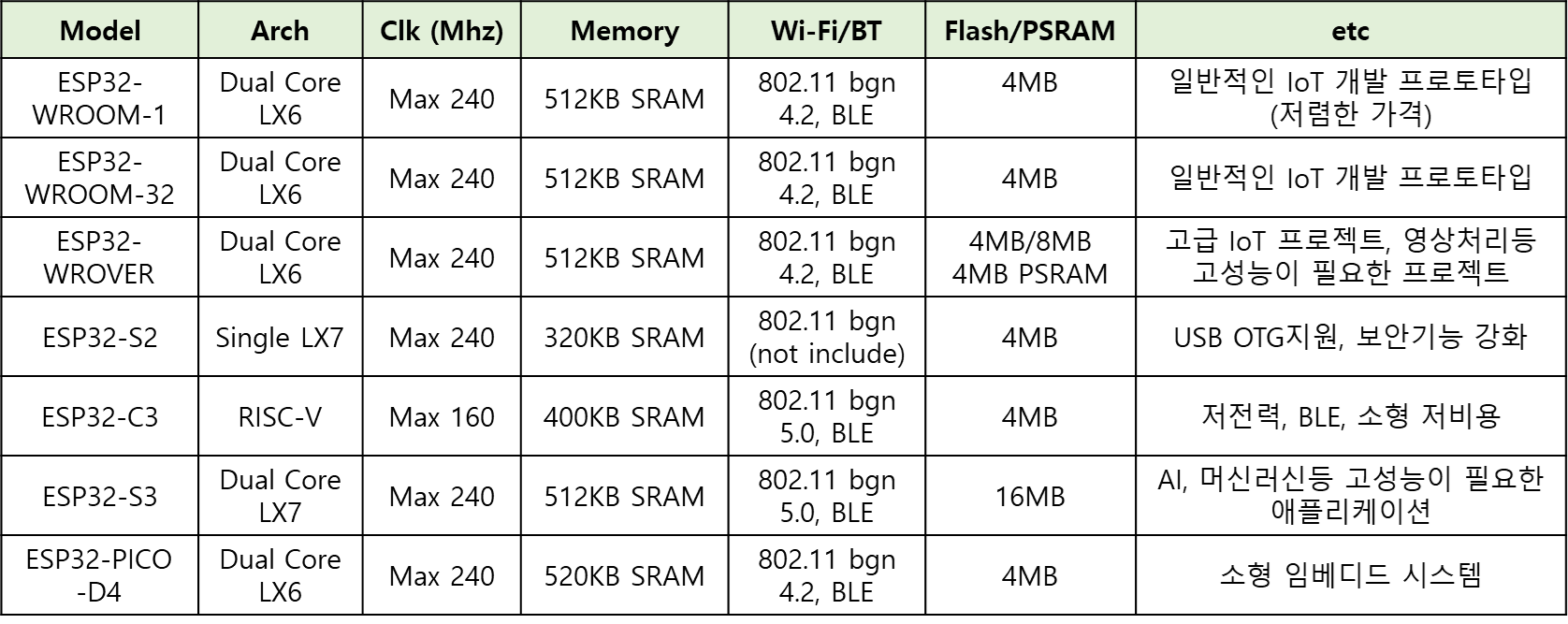 기본적으로 크게 구분하면 아래와 같이 구분이 된다고 한다. 고급모델에는 PSRAM등이 추가로 제공된다. 필자는 알리 익스프레스에서 WROOM-1과 ESP32-S3를 이용한 개발보드를 구매했다.
