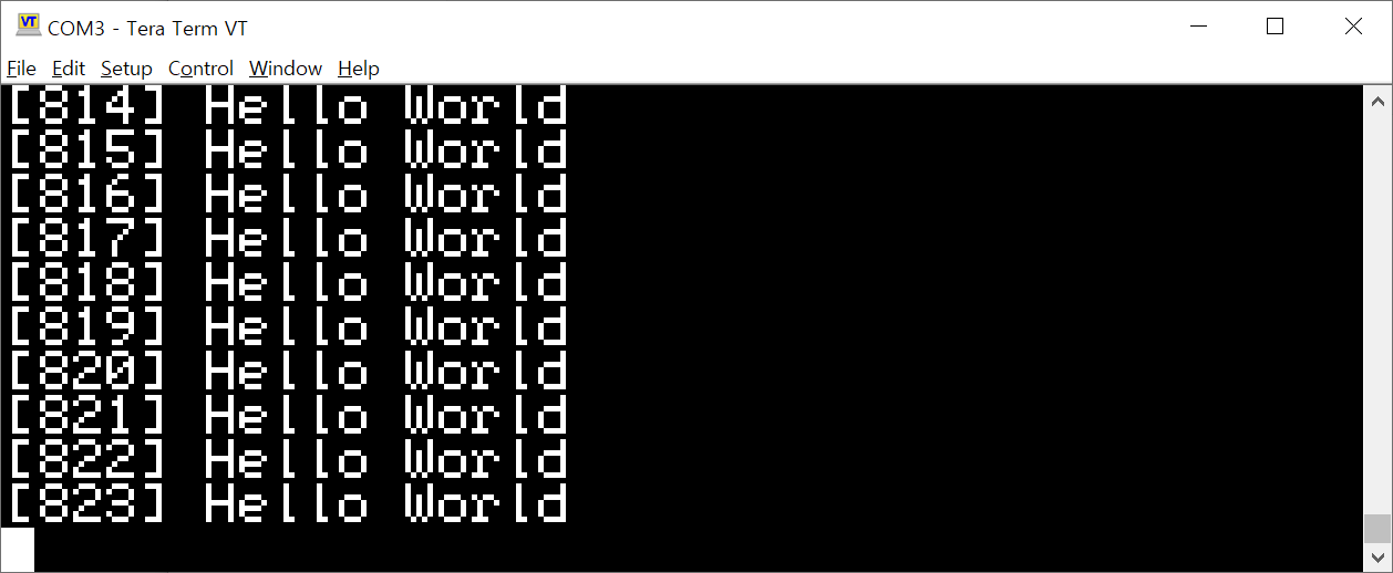 연결이 완료되고 USB케이블을 호스트에 연결한 다음 테라텀등 시리얼 프로그램을 실행하여 생성된 포트를 열면 아래의 그램과 같이 문자열이 출력됨을 확인할 수 있다.