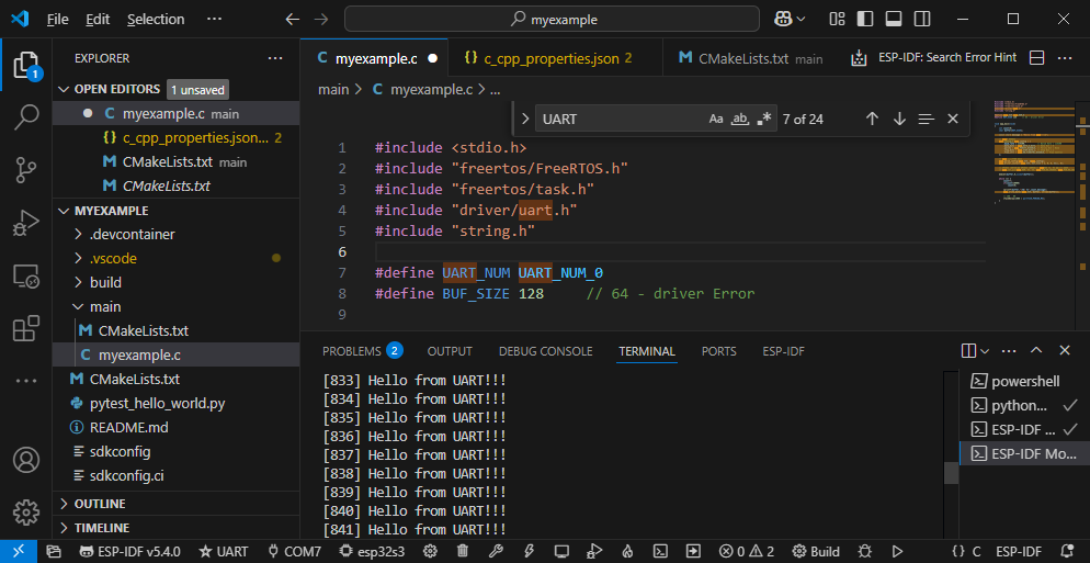 시리얼 포트를 위해서 driver/uart.h를 추가했다. 아래 예제는 Hello World from UART!! 라는 문자열 앞에 카운터를 붙혀서 시리얼 포트에 기록하는 예제이다.