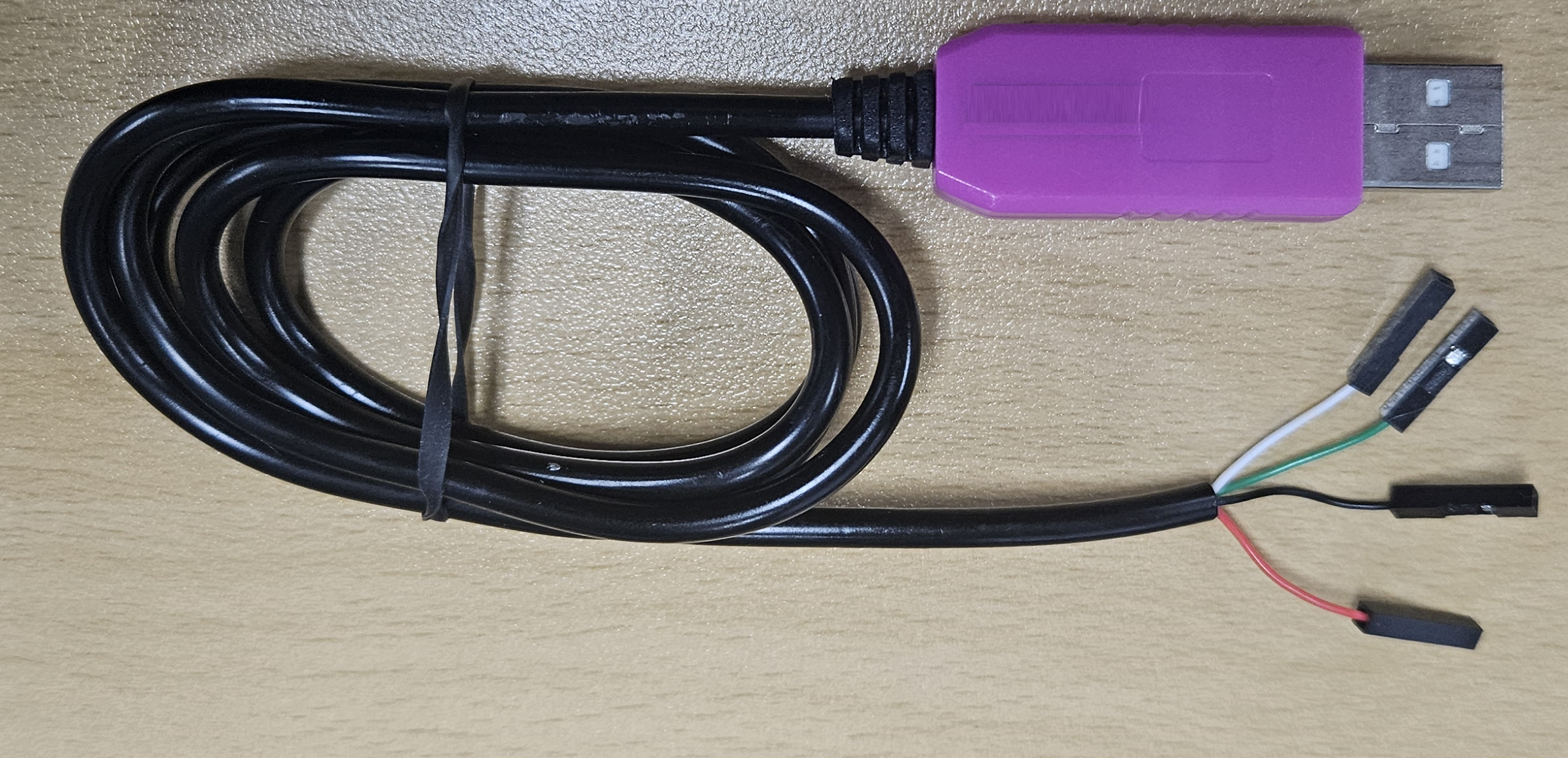 독자들이 구매한 케이블과 필자의 케이블의 형상이나 핀 색상이 다를 수 있다. 하지만 대부분의 케이블은 붉은 색은 VCC(전원), 검정색은 (GND)이다. 그럼 남은 두 선이 RX와 TX가 된다. 필자의 경우 녹색이 RX고, 흰색이 TX였다.