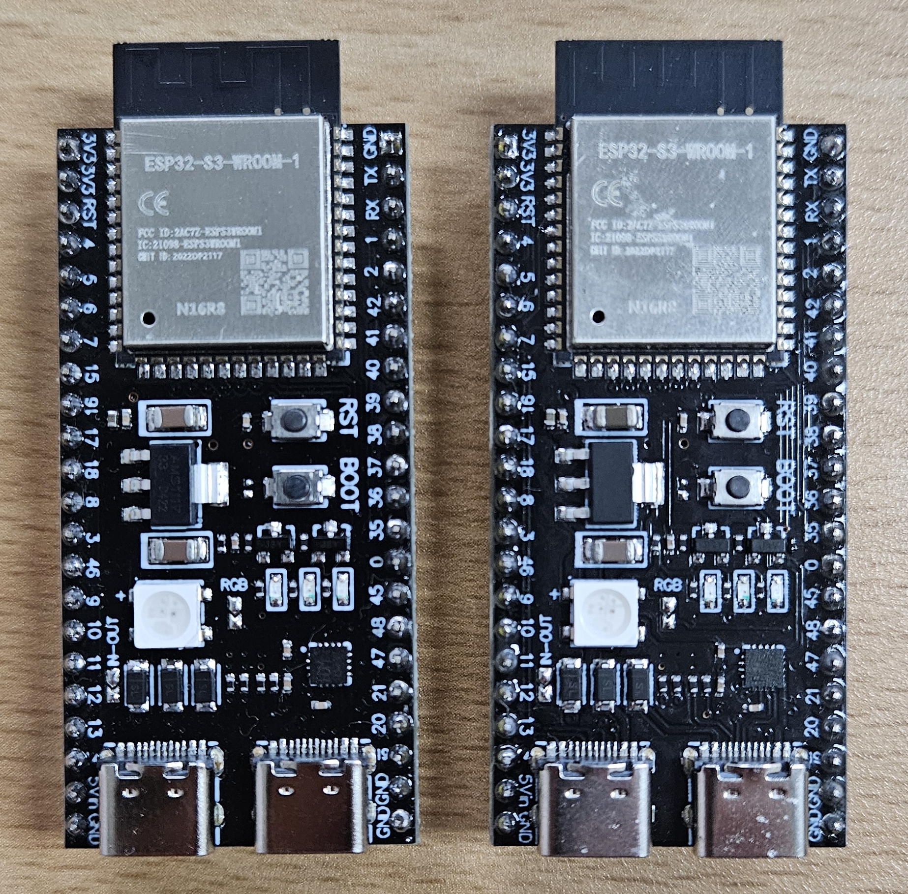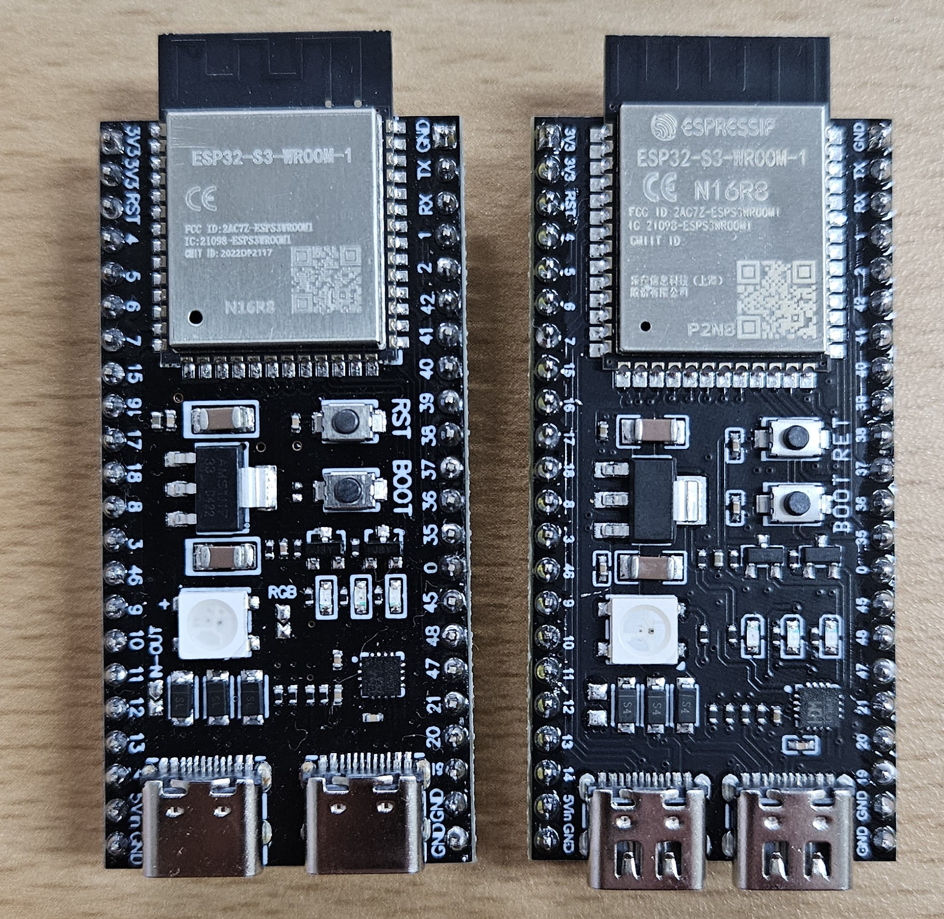 다음은 알리 익스프레스에서 2개를 더 구매했다. 아래의 그림은 처음 구매했던 거랑 추가로 구매한 제품을 비교하기 위해서 같이 촬영을 하였다. 부품은 레퍼런스를 따라 갔을테니 거의 비슷한데 말이다. USB-C 부분이 조금 돌출되어있는 구조이다. 그리고 메인 프로세서를 덮고잇는 캔에 각인된 것을 보면... 사실 구매페이지의 설명은 서로 가져다 쓴느것 처럼 동일했다. 가격만 다르지 그냥 같은제품이겠거니 했는데, PCB 형상이 다른것을 확인할 수있었다.
