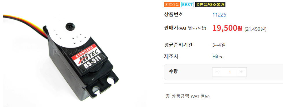 서보모터는 VIN/GND/DATA 이렇게 총 3가닥을 이용하고 DATA에 PWM을 넣어주면되겠다. 위의 두 모터는 모두 5V전압이 요구되고, HS-311은 500~600mAh 정도의 전압이 필요하다. 반대로 SG90은 250~500mAh 정도면 정상 구동이 가능하다. 그리고 페이로드(하중)없이는 적당히 나와도 동작은 된다.