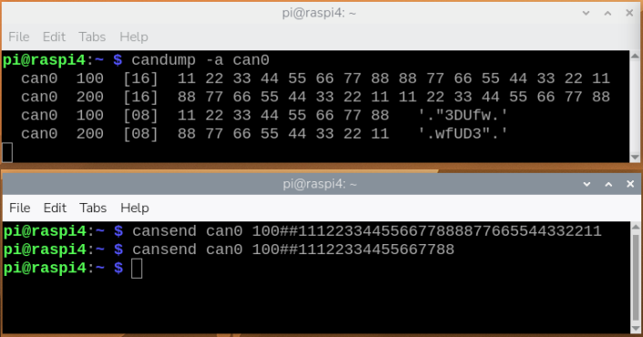 위의 명령을 실행하면 실행한쪽 좌측 터미널 candump에 보낸 데이터가 출력되고, 두번째 라즈베리파이의 candump에도 먼저보낸 데이터가 출력된다.