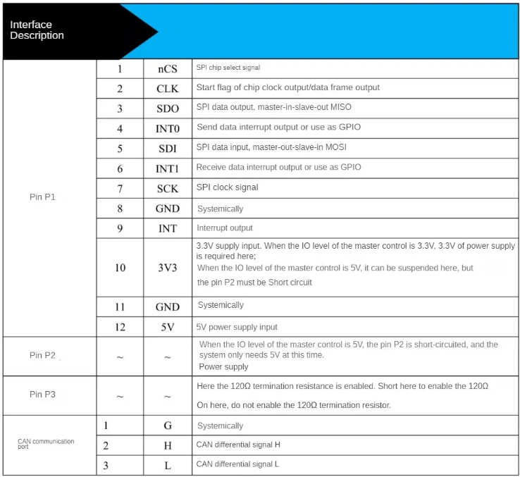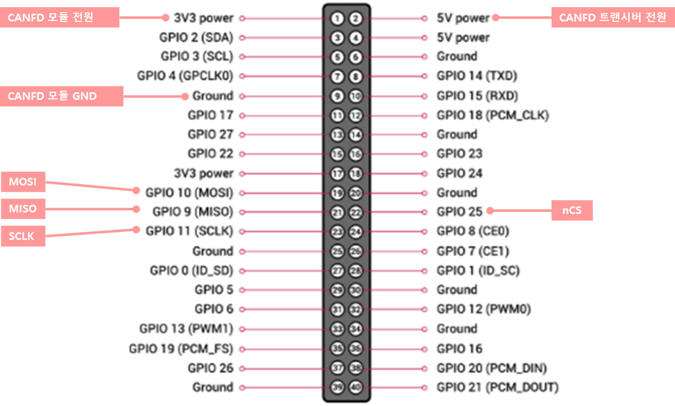 라즈베리파이와 모듈은 다음과 같이 연결 하였다. 아쉽게도 구매한 모듈의 트랜시버는 5v로 동작하고, mcp2518fd 는 3.3v로 동작하기 때문에 전원을 별도로 넣어주어야 한다. 만약, 아두이노 같은 5v 전원을 사용하는 MCU등에서는 모듈의 전원공급핀(필자가 구매한 모듈의 경우 P2)는 쇼트 시키지 않아야 한다.