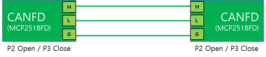 CANFD 모듈과 CAN 모듈은 연선을 사용하여 H/L/GND를 모두 연결해준다. 그리고 1:1로 연결하여 테스트를 진행하는 상황이면 짧은 거리면 크게 문제가 되지 않을 수 있지만 종단저항 핀(P3)를 쇼트 시켜주어야 한다.