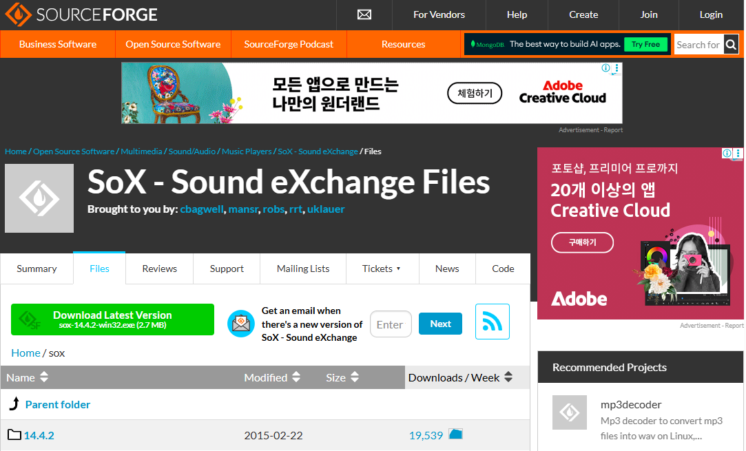 아래의 경로에서 SoX(Sound eXchange Files)를 다운로드한다. 다운로드 버전은 14.4.2를 설치한다.