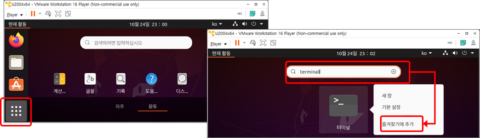 - 리눅스에서 메뉴버튼을 누르고 검색에서 terminal을 입력하여 즐겨찾기에 추가한다.