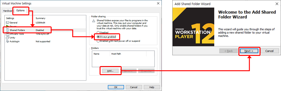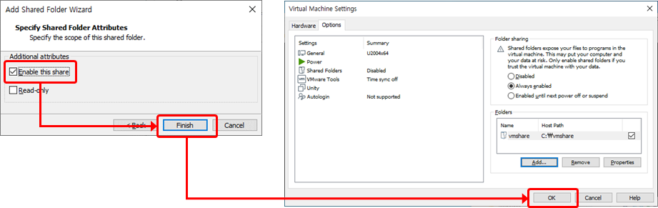 - vmware의 virtual machine settings의 Option tab에서 shared folders를 선택