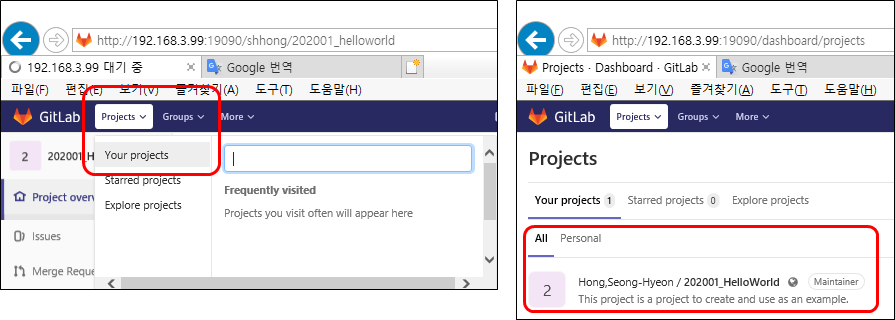 | ~/gitlab$ git clone http://192.168.3.99:19090/shhong/202001_helloworld.git ~/gitlab$ ls -al total 12 drwxr-xr-x 3 qwerty qwerty 4096 Jan 6 06:38 . drwxr-xr-x 15 qwerty qwerty 4096 Jan 6 06:28 .. drwxr-xr-x 3 qwerty qwerty 4096 Jan 6 06:38 202001_helloworld |