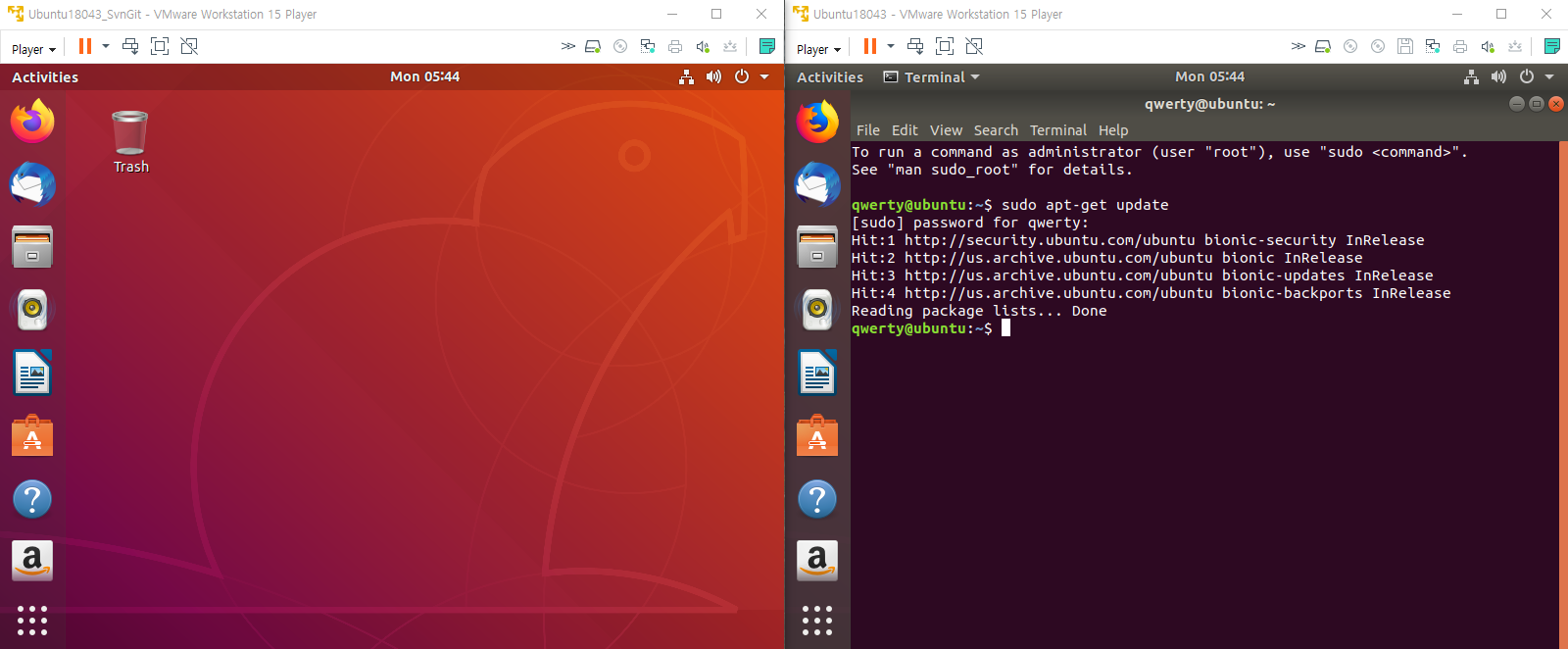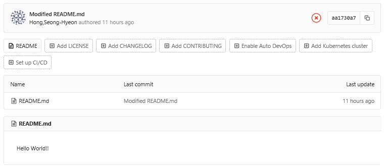 qwerty@ubuntu:~/gitlab/202001_helloworld$ git commit -m "Modified README.md" [master aa1730a] Modified README.md 1 file changed, 1 insertion(+) qwerty@ubuntu:~/gitlab/202001_helloworld$ git push -u origin master Username for 'http://192.168.3.99:19090': shhong Password for 'http://shhong@192.168.3.99:19090': Counting objects: 3, done. Writing objects: 100% (3/3), 276 bytes | 276.00 KiB/s, done. Total 3 (delta 0), reused 0 (delta 0) To http://192.168.3.99:19090/shhong/202001_helloworld.git 3a99485..aa1730a master -> master Branch 'master' set up to track remote branch 'master' from 'origin'. qwerty@ubuntu:~/gitlab/202001_helloworld$ |