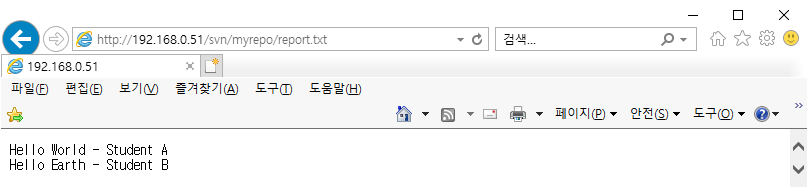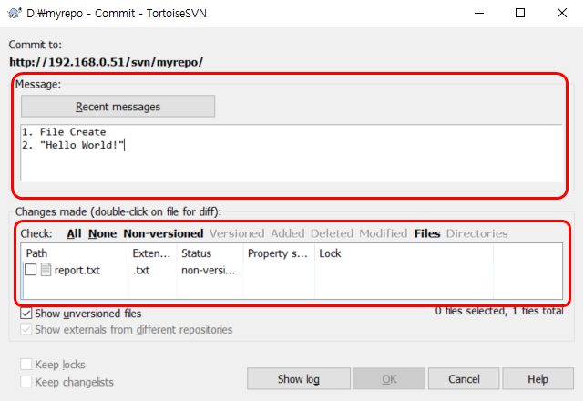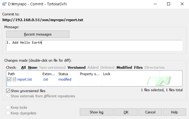 파일을 생성하고 SVN서버의 웹에서 상태를 확인해보면 아무것도 변경된 것이 없다. 커밋(Commit)을 하지 않았기 때문이다.