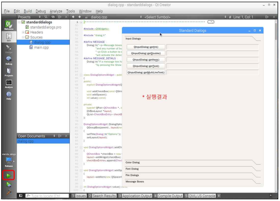 설정이 완료되었다면, QT설치시 같이 설치되었던 샘플 하나를 열어서 실행해 보도록 한다. /usr/local/qt5pi/example에서 적당한 샘플을 열어 메뉴 Build > Clean을 해주고 녹색 > 버튼을 클릭하여 싱행 해 보도록 하자