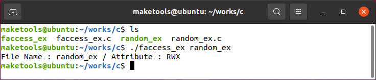 ls를 하여 현재 디렉터리에 어떤 파일이 있는지 확인한다. 그리고 예제 실행하면서 해당 파일 이름을 넣어주자. 아래의 결과를 보면 파일 이름과 파일 속성에 출력되는 것을 확인할 수 있다.