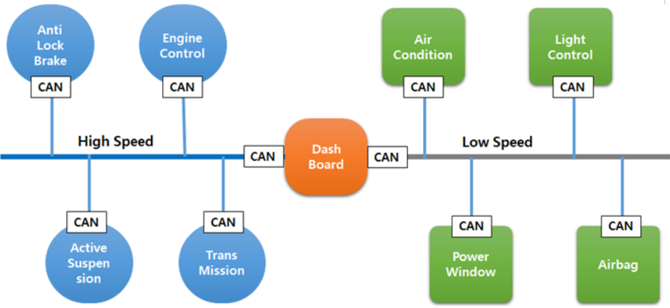 초기 CAN은 ECU간 통신을 위해 UART 방식을 고려했으나, UART는 P2P통신이므로 서로다른 2개이상의 통신을 위해 Bus방식을 사용하여 다중통신을 할 수 있도록 구성하여야 했다.
