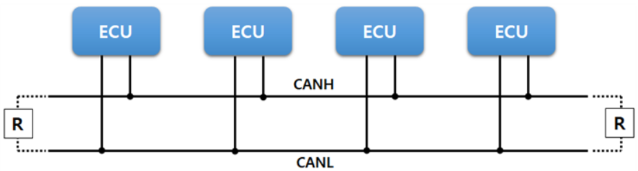 CAN은 120옴의 종단 저항을 이용하여 버스의 시작과 끝을 구분한다. 아래는 그 예를 단순화 시켜 졍리하여 그렸다. 물론, 과제 진행중 갑님들께서 부분 성형 네트워크를 구성해야 한다고 우겨서 돌아오는데 다소 많은 시간이 소요된 적이 있었다. CAN버스를 구성하는 CANH와 CANL 양 종단에 저항을 두어서 버스의 시작과 끝을 정할 수 있다.