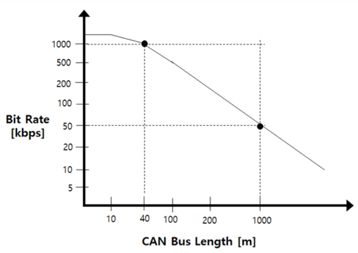 CAN은 최대 40M까지 최대 1Mbit/s의 속도를 가지며, 길이에 따라 속도와 안정성이 감소되는데, 1KM까지에서는 50kbps까지 가능하며 그 이상은 리피터를 이용하여야 한다. 아래는 CAN과 통신거리의 상관관계이다. 하지만 실제로는 모듈을 어떻게 만들었냐에 따라서 아래의 이론적인 수치보다 낮아질 수 있다.
