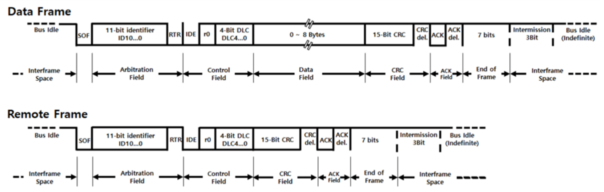 CAN은 아래와 같은 데이터 표준 프레임을 사용한다. 문서에는 필드별로 설명을 해뒀지만 블로그상에 넣지니, 내용이 너무 길어진다. 필자는 라이브러리를 사용하여 예제를 만들 거라서 프로토콜을 건드리지 않는 독자분들 께서는 필드 내용까지 알아야 할 것 같지는 않으니 넘어가도록 한다.
