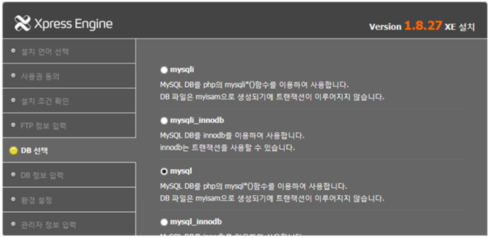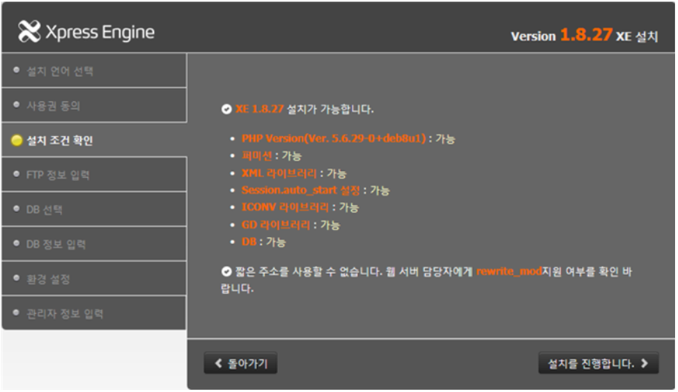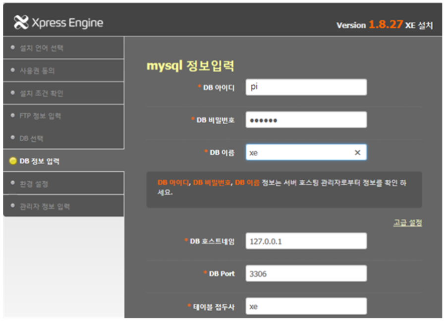 DB아이디, 비밀번호, DB 이름은 이전에 생성했던 정보를 아래와 같이 입력한다. 그리고 DB 호스트네임은 127.0.0.1(로컬호스트)로 지정하고 DB 포트는 MySQL 디폴트 포트인 3306을 이용한다. 그리고 테이블 접두사는 xe로 지정하면 된다.