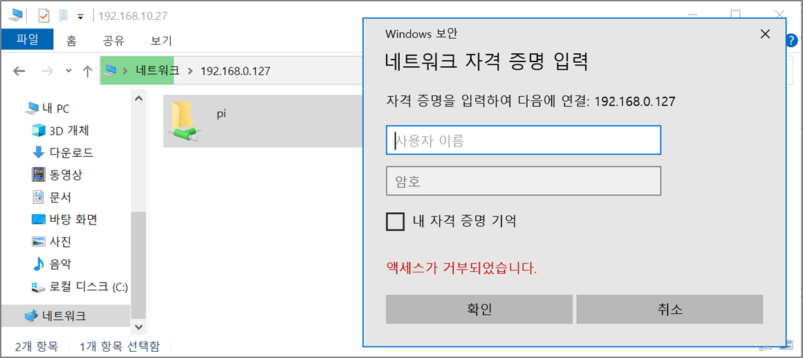 공유 폴더를 클릭시 사용자명 및 비번을 입력하라는 메시지가 출력된다. smbpasswd에서 등록한 사용자 pi와 비번을 입력해준다.